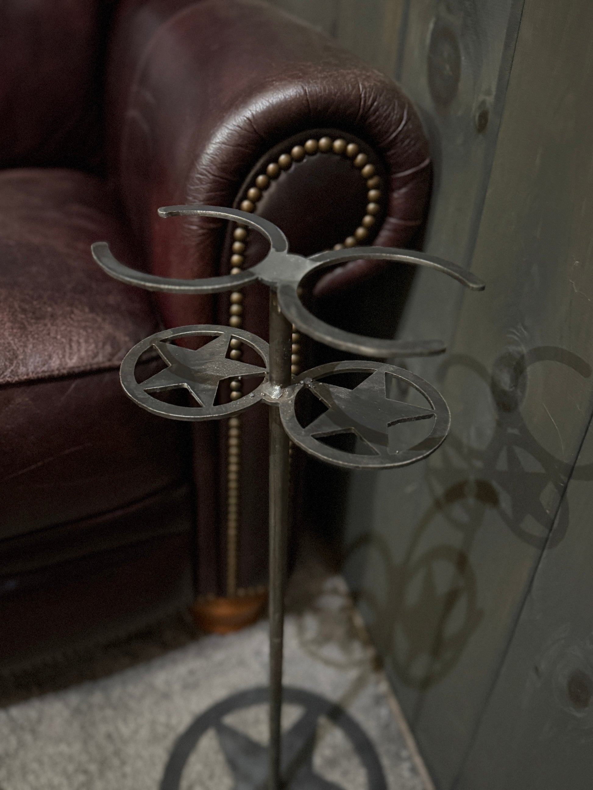 The Texas Star Cup holder stand is made of 14 gage steel, adding a touch of rustic charm to your office, living room, or outdoor game sessions. Measuring at approximately 24 by 9 1/2 inches, this stand securely holds your drinks while you work or play. Durable and functional, it's a must-have.